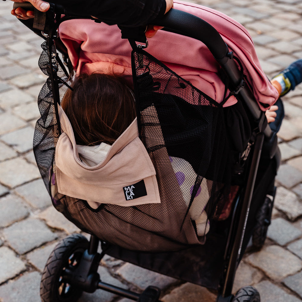 Het netje is een apart element, bevestigd aan de buitenkant van de hangmat en vastgemaakt aan het frame van de kinderwagen. De belangrijkste functie ervan is om de kans te verkleinen dat een kind zijn vingers of benen in de buurt van de wielen brengt.